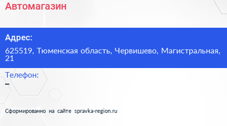 Автомагазин по адресу 625519, Тюменская область, Червишево, Магистральная, 21 в дальнейшем Организация, размещена в следующих категориях: