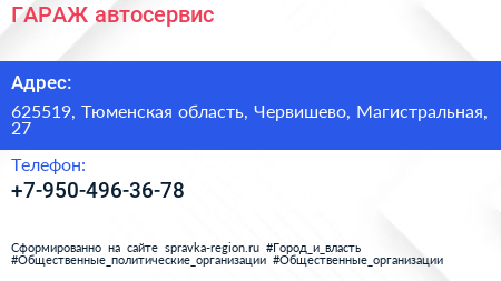ГАРАЖ, автосервис по адресу 625519, Тюменская область, Червишево, Магистральная, 27 в дальнейшем Организация, размещена в следующих категориях:
