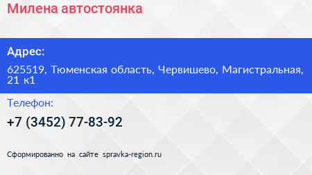 Милена, автостоянка по адресу 625519, Тюменская область, Червишево, Магистральная, 21 к1 в дальнейшем Организация, размещена в следующих категориях:
