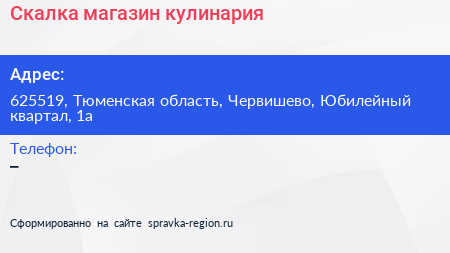 Скалка, магазин-кулинария по адресу 625519, Тюменская область, Червишево, Юбилейный квартал, 1а в дальнейшем Организация, размещена в следующих категориях: