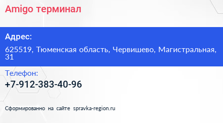 Amigo, терминал по адресу 625519, Тюменская область, Червишево, Магистральная, 31 в дальнейшем Организация, размещена в следующих категориях: