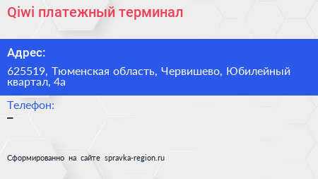 Qiwi, платежный терминал по адресу 625519, Тюменская область, Червишево, Юбилейный квартал, 4а в дальнейшем Организация, размещена в следующих категориях: