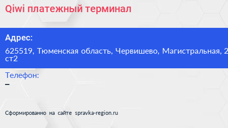 Qiwi, платежный терминал по адресу 625519, Тюменская область, Червишево, Магистральная, 2 ст2 в дальнейшем Организация, размещена в следующих категориях: