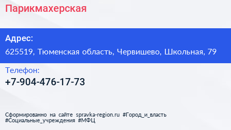Парикмахерская по адресу 625519, Тюменская область, Червишево, Школьная, 79 в дальнейшем Организация, размещена в следующих категориях:
