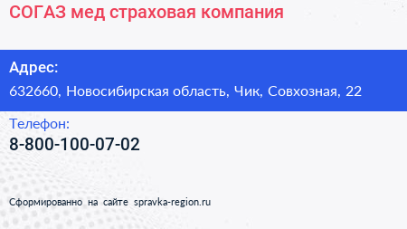 СОГАЗ-мед, страховая компания по адресу 632660, Новосибирская область, Чик, Совхозная, 22 в дальнейшем Организация, размещена в следующих категориях: