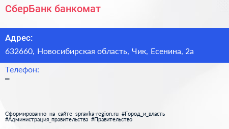 СберБанк, банкомат по адресу 632660, Новосибирская область, Чик, Есенина, 2а в дальнейшем Организация, размещена в следующих категориях: