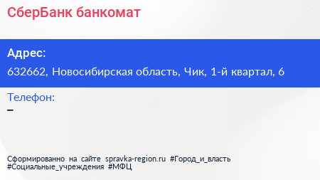 СберБанк, банкомат по адресу 632662, Новосибирская область, Чик, 1-й квартал, 6 в дальнейшем Организация, размещена в следующих категориях: