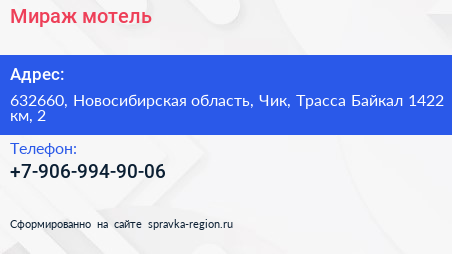 Мираж, мотель по адресу 632660, Новосибирская область, Чик, Трасса Байкал 1422 км, 2 в дальнейшем Организация, размещена в следующих категориях: