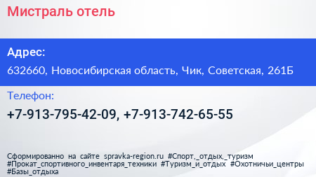 Мистраль, отель по адресу 632660, Новосибирская область, Чик, Советская, 261Б в дальнейшем Организация, размещена в следующих категориях: