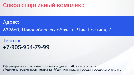 Сокол, спортивный комплекс по адресу 632660, Новосибирская область, Чик, Есенина, 7 в дальнейшем Организация, размещена в следующих категориях: