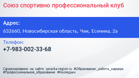 Союз, спортивно-профессиональный клуб по адресу 632660, Новосибирская область, Чик, Есенина, 2а в дальнейшем Организация, размещена в следующих категориях: