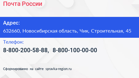 Почта России по адресу 632660, Новосибирская область, Чик, Строительная, 45 в дальнейшем Организация, размещена в следующих категориях: