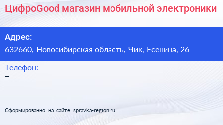 ЦифроGood, магазин мобильной электроники по адресу 632660, Новосибирская область, Чик, Есенина, 26 в дальнейшем Организация, размещена в следующих категориях: