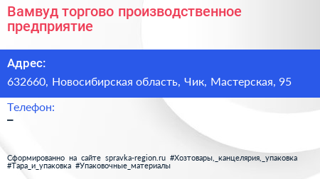 Вамвуд, торгово-производственное предприятие по адресу 632660, Новосибирская область, Чик, Мастерская, 95 в дальнейшем Организация, размещена в следующих категориях: