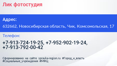 Лик, фотостудия по адресу 632662, Новосибирская область, Чик, Комсомольская, 17 в дальнейшем Организация, размещена в следующих категориях:
