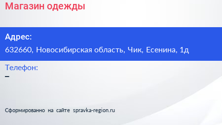 Магазин одежды по адресу 632660, Новосибирская область, Чик, Есенина, 1д в дальнейшем Организация, размещена в следующих категориях:
