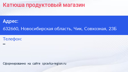 Катюша, продуктовый магазин по адресу 632660, Новосибирская область, Чик, Совхозная, 23Б в дальнейшем Организация, размещена в следующих категориях: