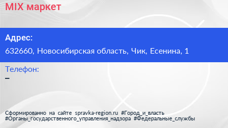 MIX маркет по адресу 632660, Новосибирская область, Чик, Есенина, 1 в дальнейшем Организация, размещена в следующих категориях:
