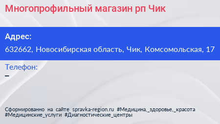 Многопрофильный магазин, рп. Чик по адресу 632662, Новосибирская область, Чик, Комсомольская, 17 в дальнейшем Организация, размещена в следующих категориях:
