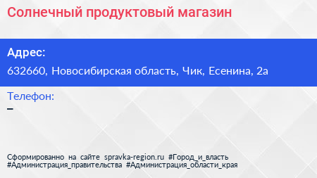 Солнечный, продуктовый магазин по адресу 632660, Новосибирская область, Чик, Есенина, 2а в дальнейшем Организация, размещена в следующих категориях: