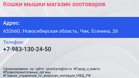 Кошки-мышки, магазин зоотоваров по адресу 632660, Новосибирская область, Чик, Есенина, 26 в дальнейшем Организация, размещена в следующих категориях: