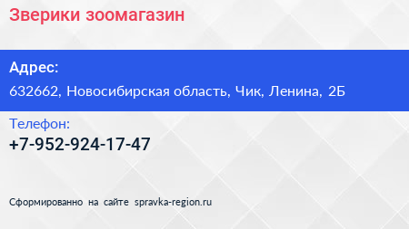 Зверики, зоомагазин по адресу 632662, Новосибирская область, Чик, Ленина, 2Б в дальнейшем Организация, размещена в следующих категориях: