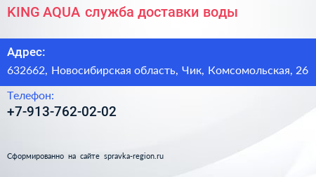 KING-AQUA, служба доставки воды по адресу 632662, Новосибирская область, Чик, Комсомольская, 26 в дальнейшем Организация, размещена в следующих категориях: