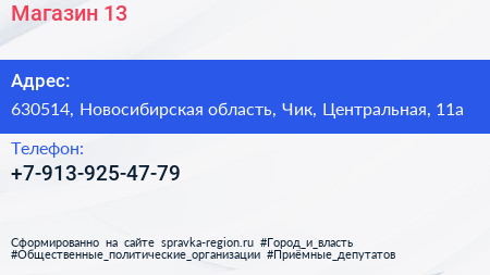Магазин №13 по адресу 630514, Новосибирская область, Чик, Центральная, 11а в дальнейшем Организация, размещена в следующих категориях: