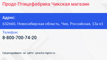 Продо Птицефабрика Чикская, магазин по адресу 632660, Новосибирская область, Чик, Российская, 13а к1 в дальнейшем Организация, размещена в следующих категориях: