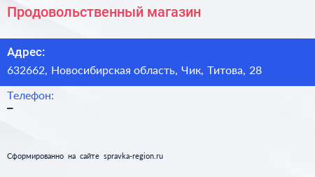 Продовольственный магазин по адресу 632662, Новосибирская область, Чик, Титова, 28 в дальнейшем Организация, размещена в следующих категориях: