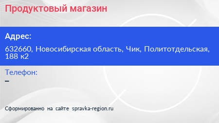 Продуктовый магазин по адресу 632660, Новосибирская область, Чик, Политотдельская, 188 к2 в дальнейшем Организация, размещена в следующих категориях: