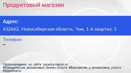 Продуктовый магазин по адресу 632662, Новосибирская область, Чик, 1-й квартал, 5 в дальнейшем Организация, размещена в следующих категориях: