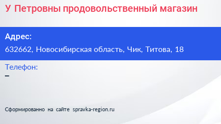 У Петровны, продовольственный магазин по адресу 632662, Новосибирская область, Чик, Титова, 18 в дальнейшем Организация, размещена в следующих категориях: