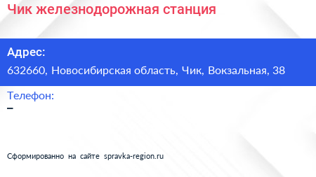 Чик, железнодорожная станция по адресу 632660, Новосибирская область, Чик, Вокзальная, 38 в дальнейшем Организация, размещена в следующих категориях: