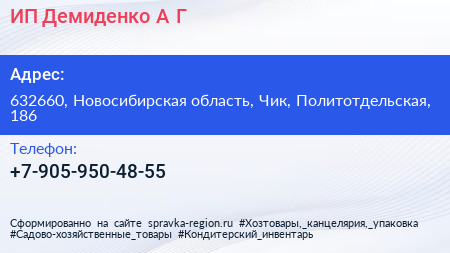 ИП Демиденко А.Г. по адресу 632660, Новосибирская область, Чик, Политотдельская, 186 в дальнейшем Организация, размещена в следующих категориях: