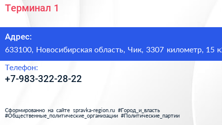 Терминал 1 по адресу 633100, Новосибирская область, Чик, 3307 километр, 15 к2 в дальнейшем Организация, размещена в следующих категориях: