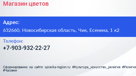 Магазин цветов по адресу 632660, Новосибирская область, Чик, Есенина, 1 к2 в дальнейшем Организация, размещена в следующих категориях: