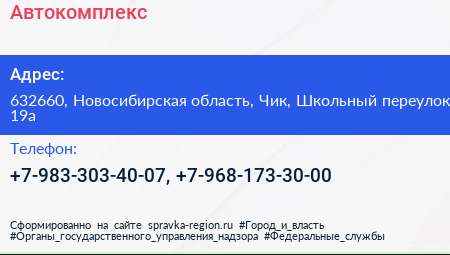 Автокомплекс по адресу 632660, Новосибирская область, Чик, Школьный переулок, 19а в дальнейшем Организация, размещена в следующих категориях: