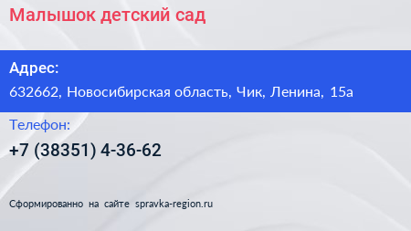 Малышок, детский сад по адресу 632662, Новосибирская область, Чик, Ленина, 15а в дальнейшем Организация, размещена в следующих категориях: