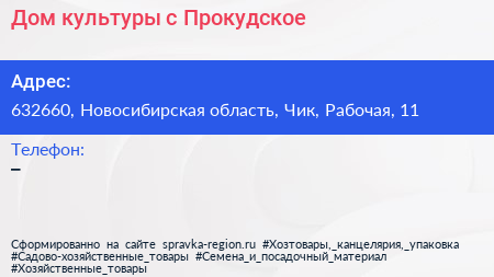 Дом культуры, с. Прокудское по адресу 632660, Новосибирская область, Чик, Рабочая, 11 в дальнейшем Организация, размещена в следующих категориях: