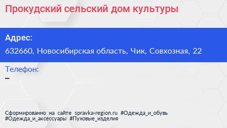 Прокудский сельский дом культуры по адресу 632660, Новосибирская область, Чик, Совхозная, 22 в дальнейшем Организация, размещена в следующих категориях: