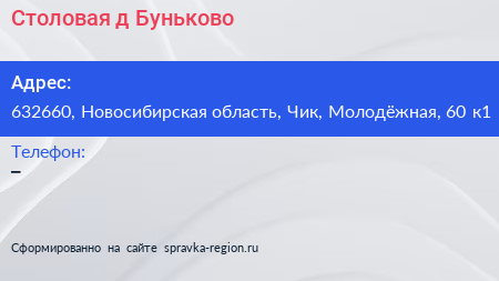 Столовая, д. Буньково по адресу 632660, Новосибирская область, Чик, Молодёжная, 60 к1 в дальнейшем Организация, размещена в следующих категориях: