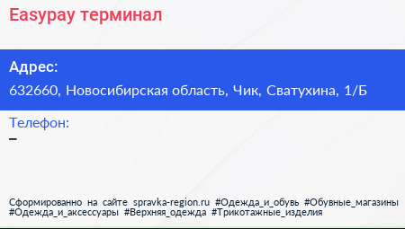 Easypay, терминал по адресу 632660, Новосибирская область, Чик, Сватухина, 1/Б в дальнейшем Организация, размещена в следующих категориях: