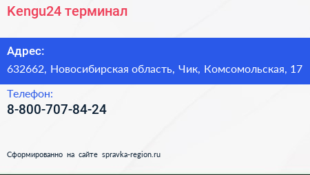 Kengu24, терминал по адресу 632662, Новосибирская область, Чик, Комсомольская, 17 в дальнейшем Организация, размещена в следующих категориях: