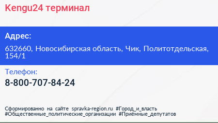 Kengu24, терминал по адресу 632660, Новосибирская область, Чик, Политотдельская, 154/1 в дальнейшем Организация, размещена в следующих категориях: