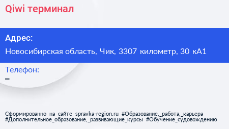 Qiwi, терминал по адресу Новосибирская область, Чик, 3307 километр, 30 кА1 в дальнейшем Организация, размещена в следующих категориях: