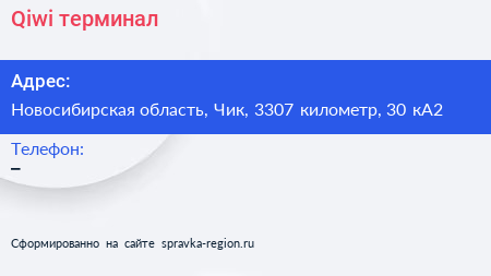 Qiwi, терминал по адресу Новосибирская область, Чик, 3307 километр, 30 кА2 в дальнейшем Организация, размещена в следующих категориях: