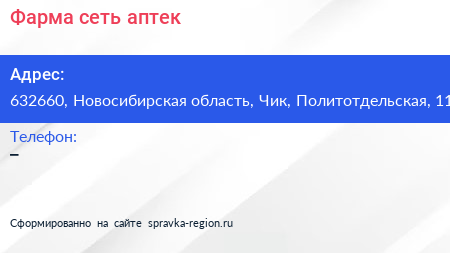 Фарма, сеть аптек по адресу 632660, Новосибирская область, Чик, Политотдельская, 11 в дальнейшем Организация, размещена в следующих категориях:
