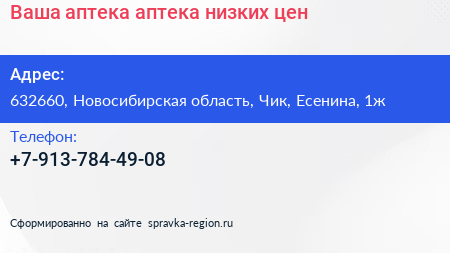 Ваша аптека, аптека низких цен по адресу 632660, Новосибирская область, Чик, Есенина, 1ж в дальнейшем Организация, размещена в следующих категориях: