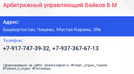 Арбитражный управляющий Байков Б.М. по адресу Башкортостан, Чишмы, Мустая Карима, 39в в дальнейшем Организация, размещена в следующих категориях:
